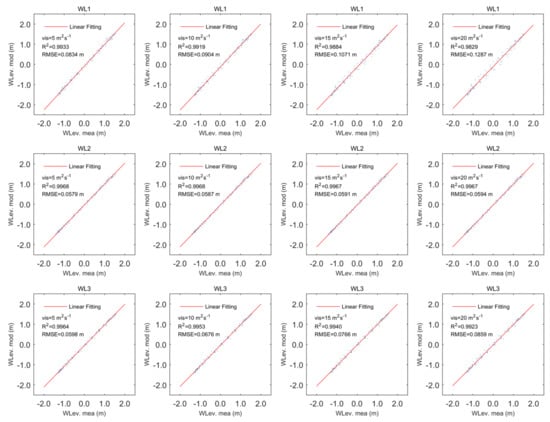 For the calibration of the model, different values of and (5, 10, 25 and 20 m2/s) were used. The performance of the different calibration values can be assessed against water level variations (WL1, WL2, and WL3). As an example, Figure 6 shows the calibration results with their respective statistical parameters (Correlation Coefficient, R2 and Root Mean Square Error, RMSE).