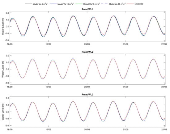 As can be observed in Figure 6, the best validation results were obtained for the values of 10 m2/s for both and . Therefore, those values were retained for implementation in the model. For the same validation tests, time-series (for a period of 4 days) of the water level are illustrated in Figure 7. Major differences (up to about 0.3 m) between measured and numerical values were observed at low and high tides at Station WL1. Such differences may be due to local effects at Station WL1, which are not fully captured by the numerical model.