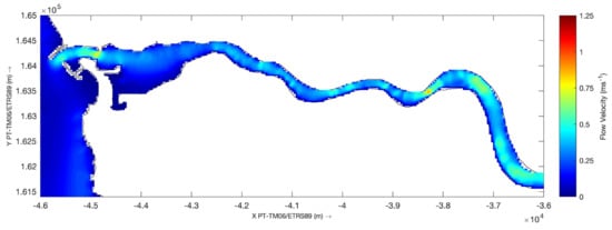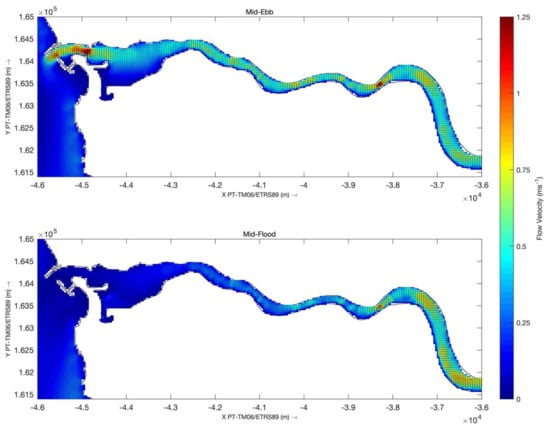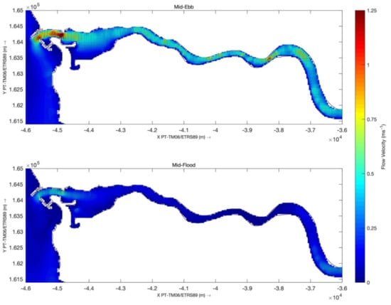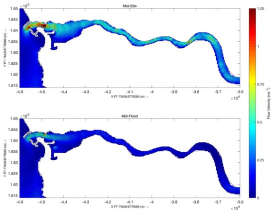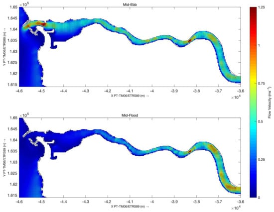 As can be observed in Figure 8, for S1 (i.e., using winter river discharges of 833.10 m3/s during a mean spring tide), significantly stronger currents occurred at mid-ebb. This characteristic occurred since the driving forces of the flow (river discharges and tide) were applied in the same direction. In this case, flow velocities that easily exceeded 1.25 m/s at the mouth of the estuary were observed. Furthermore, in the inner part of the estuary where the effect of the river discharge is predominant, multiple locations presented flow velocities in the order of 1 m/s. Conversely, at mid-flood, the flow velocities at the estuary mouth were significantly lower, since the direction of the flow driven by the tide opposed the flow driven by the river discharges. In the inner estuary, the behaviour is similar to the mid-ebb scenario.