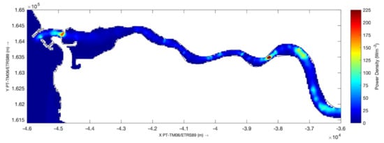 As can be observed in Figure 14, the TSE index limited the number of potential tidal sites, being these are mainly limited to the inner estuary, in which the TSE index values reached up to 2.8. In consequence, the areas with the highest potential were analysed in detail by assessing the time-series distribution of the flow velocity and power density, using for this purpose a complete-neap tidal cycle under mean river discharges.