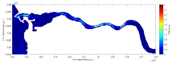 Figure 13 shows the mean annual power density of the estuary. As can be observed, three areas, with two of them located in the inner estuary and the other one at the river mouth, could potentially be exploited, since they present mean annual power densities that close to 0.4 kW/m2. However, for depth-limited regions such as the Douro Estuary, the available water depth plays a major role in the selection of potential tidal sites. To account for these potential limitations, the spatial distribution of the TSE index was computed for the estuary according to Equation (3). For the present study, the TSE index was computed throughout the estuary for S6 by considering the mean annual values of fluvial discharges (Figure 12). Furthermore, according to the characteristics of the Douro Estuary, the values for the characteristic velocity (V0) and water depth (h0) were set to 0.5 m/s and 6 m, respectively. These values were adopted based on figures provided by Fertahi [40] and taking into consideration available water depths. However, it has to be pointed out that the mentioned values may vary based on other specific TEDs considered [20]. For the scope of this study, generic TEDs, that satisfy the adopted V0 and h0, were consequently assumed.