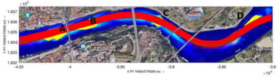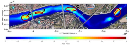 Four areas (A to D) throughout the Douro Estuary were identified as of potential interest for tidal and river in-stream energy exploitation based on the results of the Tidal Stream Exploitability (TSE) index [14]. Table 4 summarizes the main characteristics of the areas identified through the site selection procedure. Indicative locations of these areas are illustrated in Figure 15.