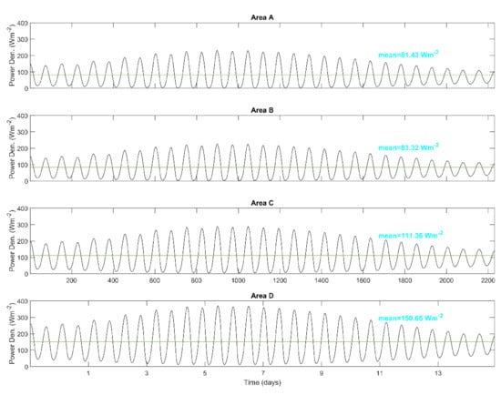 As also confirmed by Figure 18—where the power density for all locations is provided—the results confirm that Area D is the most convenient location for the exploitation of the tidal and hydrokinetic resource. Additionally, it highlights the effects of cubic dependence of the power density with the tidal flow, since variations of 0.2 m/s in peak flow velocities translated into differences of almost 200 Wm2 of available power density. As indicated in Figure 18, the mean power density for Area D was ca. 66 Wm−2 higher than in Areas A and B and ca. 39 Wm−2 higher than in Area C.