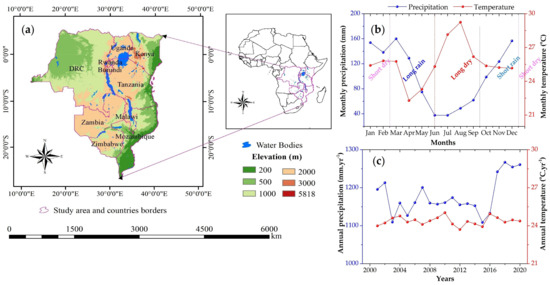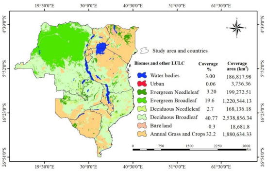 This study was conducted in the Great Lakes region of Sub-Saharan Africa (GLR–SSA), occupying the surface area of approximately 6.3 million km2. This region extends over the African Great Lakes countries including the Democratic Republic of Congo (DRC), Burundi, Rwanda, Tanzania, Kenya and Uganda in east–central Africa and Zambia, Malawi, Mozambique and Zimbabwe in southern Africa. The European Space Agency Climate Change Initiative, Land Cover, ESA-CCI-LC [22], indicated that the major land cover types are: forest (~65.32%), cropland (~23.14%) and grassland (~7.42), while the other physical land cover (LC) types including built-up, wetlands, inland water and barren areas cover the remaining surface extent (~4.12%).