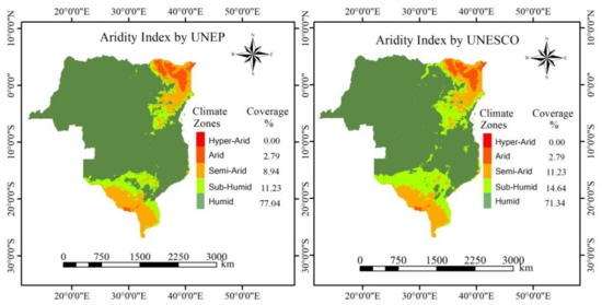 Generally, AI is expressed on the annual basis as the fact that the degree of dryness cannot be determined at daily or monthly time scales, which differentiates the aridity and drought concepts [21,51]. To optimize our AI estimation onto the GLR-SSA tropical climate [52], we have applied the mean annual values of PET and Prec to calculate the AI from 2001 to 2020. Moreover, the AI values were classified in accordance with UNEP and UNESCO aridity classification limits based on Thornthwaite (UNEP 1992) and Penman (UNESCO 1978) methods, respectively (Table 3 and Figure 3).