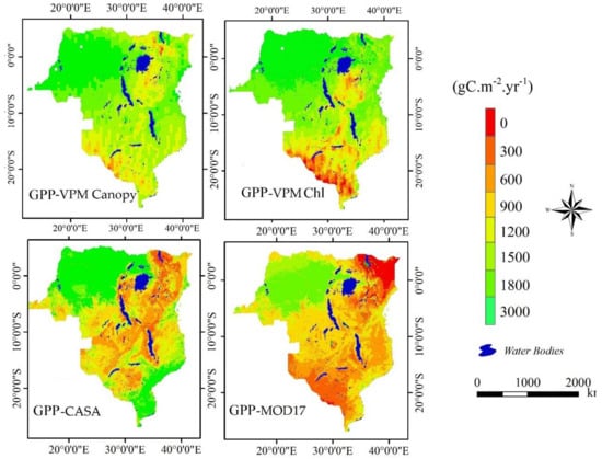 The combined of vegetation indices and climate factors have been often used to simulate seasonal and annual GPP dynamics [17]. The vegetation phenology APAR at canopy level and APAR at chlorophyll were highly suggested to separate GPP estimates [6,44]. The distinctions between APAR canopy and APAR chlorophyll reactions and the PAR absorbed photosynthetic components were considered as fundamental components and main datasets to run the employed LUE models (Section 2.3.2). Given that, the ecosystems characterized by high vegetation cover (high EVI and NDVI values) indicated high GPP values [8,9,10,19]. This was supported by the results of this study where high values of GPP were found in the lower plateau of the Democratic Republic of Congo (DRC) and the areas closer to Indian Ocean coastlines, while the non-vegetated areas such as high mountain regions and the Kalahari Desert were characterized with lower GPP values (Figure 4).