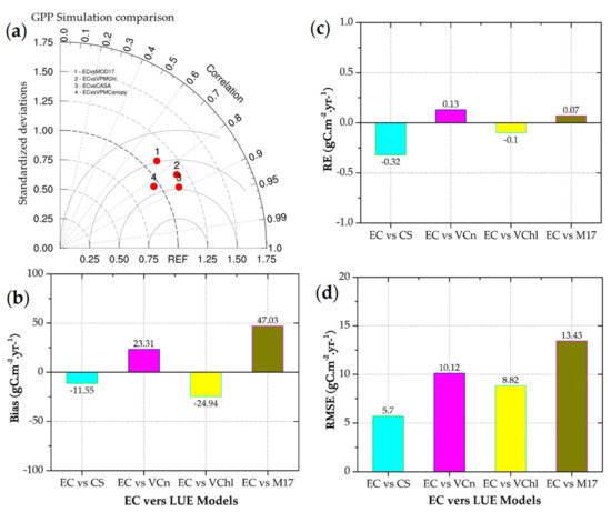 The overall accuracy between the observed and simulated GPP results and LUE models simulation stability assessment results. (a) Taylor diagram indicating the standard deviation and correlation between the observed GPP-based on FLUXCOM (GPP-EC) and the simulated GPP-based on CASA, VPMCanopy, VPMChl and the observed MOD17A2H at significant level p < 0.05, (b) root mean square errors, (c) relative errors and (d) bias values between the observed GPP values and the simulated values. EC stands for GPP-EC; CS for CASA; VChl for VPMchl; Vcn for VPM canopy; and M17 for MOD17A2H.