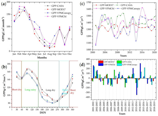 GPP is a function of vegetation processes and climate variability. Hence, the performance of GPP variability considered the vegetation indices, vegetation status and climate factors at seasonal and inter-annual time series datasets, as illustrated in Table 1.