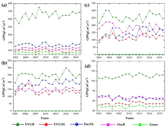 However, among the simulations results, the GPP-CASA results showed the highest mean GPP values for EVGB varied in the range from 246 to 375 g C·m−2·yr−1 with a standard deviation ranging from ± 1.54 to ± 6.14 g C·m−2·yr−1, and the annual GPP change rate ranged between −3.31 and 6.67g C·m−2·yr−1 compared to the other LUE models and the observed MODIS-GPP.