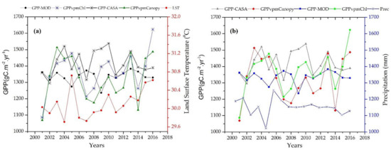 Comparison of temporal variations in GPP and climate factors (air temperature and precipitation). (a) Annual mean GPP with annual mean precipitation, and (b) annual mean GPP with annual mean land surface air temperature.