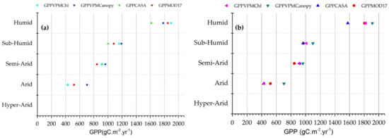 Generally, the spatial gradients of regional climate zones from hyper-arid to humid and GPP variations in Figure 10 indicated a consistency of the fact that GPP or carbon uptake through photosynthesis processes increase with the increase of precipitation and temperature. These results converge with previous studies that examined the effect of climate factors on GPP variations using an inter-comparison of multiple models [66,67], where they concluded that GPP varies proportionally with precipitation and temperature. Our results pointed out that the spatial and temporal variations of GPP were mainly controlled by the temperature and precipitation variability.