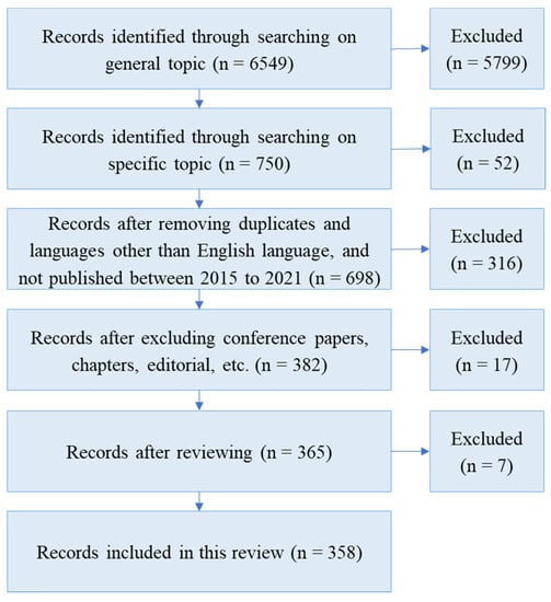 The main objective of this review is to reveal the best practices of sustainable transportation in the literature, the areas of concern, and eventually, identify future research directions. Published research focused on case studies in sustainable transportation were extracted from the Scopus database. Figure 1 depicts the process of extraction. It is influenced by the flowchart of the PRISMA statement [] (Moher et al., 2009). For answering the questions drafted in the introduction of this study, a combination of different words such as “sustainable transportation”, or “sustainable mobility”, or “sustainable transport” to find records of the general topic. A total of 6549 records were identified through searching on the general topic, of which 5799 were excluded, by using a combination of words such as “case study,” as irrelevant records in the next stage. Among 750 records, 52 records were excluded after removing duplicates and languages other than the English language and not published between 2015 and 2021. After excluding conference papers, chapters, editorial, etc., the records were 382, among which 17 were excluded after reading abstracts. Then, 7 articles were excluded after screening and assessing for eligibility. In the end, 358 papers were included in this review. In this step, for structuring our database, the following information was needed to be considered: the year of publication, journal of publication, publisher, author keywords, geographical location, transport mode, and the researcher’s primary area of concern.