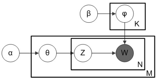 In the modeling stage, the Latent Dirichlet allocation (LDA) model was used to explore the topics behind the prepared text data. “LDA is a generative probabilistic model of a corpus, and its basic idea is that documents are represented as random mixtures over latent topics, where each topic is characterized by a distribution over words [].” LDA could be used “as an intuitive approach for calculation of similarity between source files and obtain their respective distributions of each document over topics [].” Figure 2 explains its generative process for a corpus D consisting of M documents each of length N.