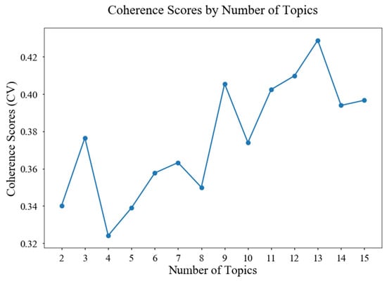 Figure 3 shows the coherence scores (CV) by different numbers of topics. Topic coherence measurement is set to evaluate the coherence between topics. Stevens et al. [] mentioned that topic coherence measures score a single topic by measuring the degree of semantic similarity between high scoring words in the topic, and these measures help distinguish between topics that are semantically interpretable topics and topics that are artifacts of statistical inference. There are various coherence measurements such as Cumass, Cuci, Cnpmi, and Cv. Röder et al. [] proved in their essay that Cv has overall best performance among them. So, Cv is used to evaluate the number of topics in the study.