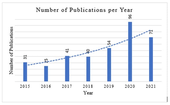 Although the number of publications in the first years of this almost seven years period was obtrusively low compared to the average, we see a drastic change in the year 2020, pointing to an increase in 2021 (Figure 5). The pandemic has acted as an accelerator and prompted not only scholars but many people to think about sustainable transportation []. In the abstracts of the dataset, “COVID” was repeated 15 times, “pandemic” was repeated 13 times, and “health” was repeated over 70 times. However, the larger number of publications in road transportation-related categories, compared to other groups, is a denotation of a depreciatory perspective towards reaching sustainability in other areas, such as maritime and air transport.