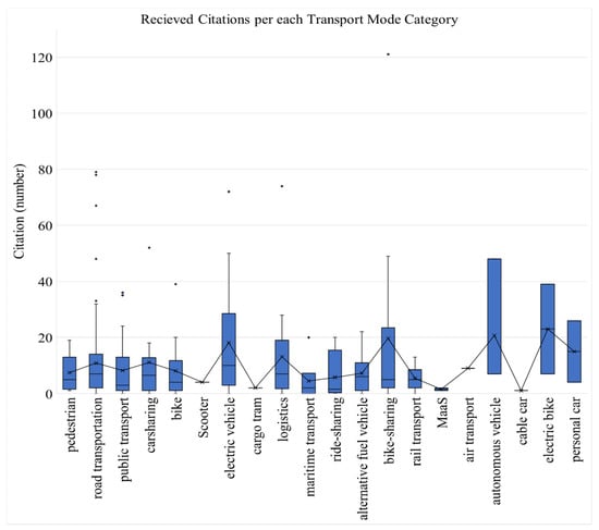 Figure 6 presents received citations per each transport mode category. For this study, the exclusive median was considered. We could see that “bike-sharing (17.15),” “electric vehicles (15.13),” “electric bikes (20),” and “autonomous vehicles (15)” have attained the most citations on average (Figure 6). Articles concerning “bike-sharing” published in 2020 and 2021 have an average citation of 7.125, articles with a focus on electric vehicles published in 2020 and 2021 have an average citation of 8, and the only two papers on autonomous vehicles in 2020 have an average citation of 7; This low number of citations could be due to fact that they were published in 2020, and 2021 and therefore may have not yet reached their full potential in terms of citations; They might become more popular in the future. Road transportation, as a general category, is also far left behind other categories regarding its top-of-the-list position in Table 3. Sustainable transportation in other transport modes such as “scooters,” “cable cars,” “air transport,” and “maritime transport” need to be studied more. For instance, not only are there ways to reduce the negative impacts of boats [] but including water transport into inland transportation, a case study on the Danube region, facilitates the transition to sustainable transportation [].