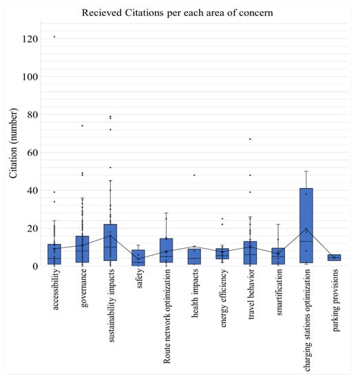 To enable sustainable transportation, throughout the years, different criteria have been identified or used by scholars, such as carbon dioxide (CO2) emissions, energy efficiency, safety, user satisfaction, etc. [,,]. Considering these criteria, authors also categorized papers into different categories based on their primary areas of concern (Figure 7). For this study, the exclusive median was considered. The medians of certain categories show the potential of each category to attain more citations. Therefore, these figures will change in coming years in favor of categories such as “sustainability impacts” and “optimization” regarding the steady growth of the number of publications in these groups. The category of “health impacts” has received an average citation of 8.85 more than categories of “accessibility (7.71),” “travel behavior (8.18),” whereas it only contains seven studies, of which three have been performed in 2021 (Figure 7).