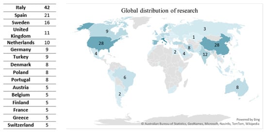The distribution of research, based on the number of publications, weighs heavily on developed countries mostly in Europe such as Italy (42), Spain (21), Sweden (16), and of course, the United States (28), China (28), and India (12) (Figure 8).