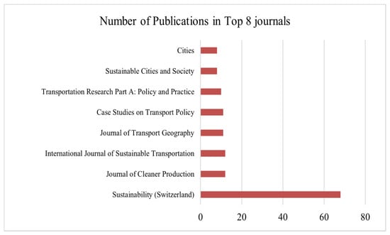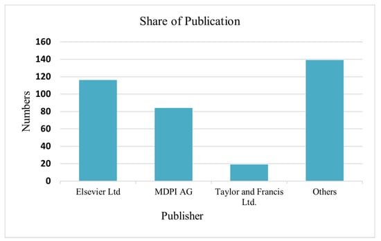 Among all publishers, Elsevier Ltd., with 32%, dominates the whole publication spectrum, followed by MDPI with 24% (Figure 9). The journal Sustainability, with 68 papers, has a significant proportion of publications in this cohort (Figure 10).