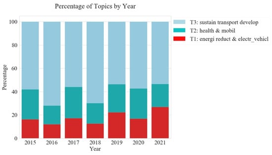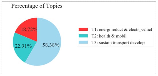 The named topics are used to analyze the trend of the topics. Figure 11 shows the percentage of topics in the publications. Around 58% of publications are associated with topic 3: “sustain transport develop” whereas 22.91% are within topic 2: “health & mobil” and 18.72% are associated with topic 1: “energi reduct & electr_vehicl” (Figure 11).