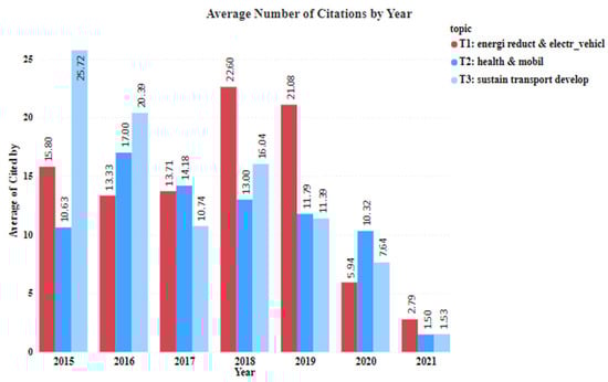 Figure 13 shows the average number of citations by topic and year. Topic 3: “sustain transport develop” has a consistent drop in the average number of citations. The average number of citations of topic 2: “health & mobil” and topic 1: “energi reduct & electr_vehicl” has a surpass over that of topic 3, “sustain transport develop” in 2017. Although topic 3 is the dominant topic, it seems to become less popular after 2018, whereas topic 2 and topic 1 have become more popular (Figure 13).