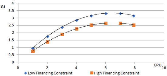 However, when economic policy uncertainty continues to rise to a certain level, it will have a restraining effect on corporate innovation. (1) Based on the theory of real options, from the perspective of waiting for options, when the uncertainty of economic policy continues to increase, the uncertainty of the external environment will rise sharply, leading to an increase in the waiting value of options. As time goes by, more and more effective information will be presented, and companies will make decisions to delay investment. Due to the existence of investment irreversibility and principal-agent problems, when the economic policy uncertainty is high, the external environment of the enterprise is confusing and it is difficult for enterprise managers to predict the future development of the enterprise. For the purpose of maximizing their own interests, managers will choose to reduce innovative investment and often invest funds in projects that are most beneficial to them. (2) Sufficient funds are an important guarantee for innovative activities. When economic policy uncertainties continue to increase, financial market frictions and the risk of external capital providers of enterprises increase, which in turn, will cause corporate financing costs to increase. When the economic policy is uncertain, banks cannot accurately judge the risk and return of credit in the market, so they will choose a more conservative credit policy. These unfavorable factors will increase the financing constraints of enterprises and cause enterprises to reduce their investment in innovation, which has a restraining effect on innovation. (3) As economic policy uncertainties increase, market risks increase and corporate innovation activities themselves have certain risks. The superposition of risks will bring more adverse effects to companies, and some companies will choose to reduce their innovation investment. Therefore, too high uncertainty in economic policies will also inhibit corporate green innovation.