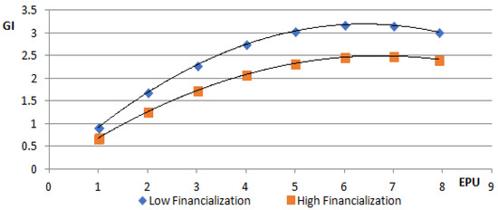 Table 2 reports the regression results of the impact of economic policy uncertainty, EPU, on the enterprise of green innovation GI after controlling the fixed effect of the year. Column (1) is the regression result of the impact of economic policy uncertainty EPU1 on enterprise green innovation GI when measuring economic policy uncertainty according to the Baker index. Column (2) is a local officials’ communication network constructed by a complex network model to measure the uncertainty of economic policy and obtain the regression result of the impact of economic policy uncertainty EPU2 on enterprise green innovation GI. The results of both empirical tests show that the regression coefficient of the primary term of EPU is significantly positive at the 1% level, and the regression coefficient of the second term of EPU is significantly negative at the 1% level, indicating that there is an inverted U-shaped relationship between economic policy uncertainty, EPU, and enterprise green innovation, GI. In the initial stage, the increase in economic policy uncertainty will promote the green innovation of enterprises, but the high uncertainty of economic policy will inhibit the green innovation of enterprises.