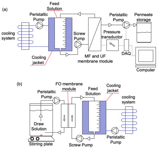 Filtration setups used in this study. (a) Micro and ultrafiltration. (b) Forward osmosis setup.