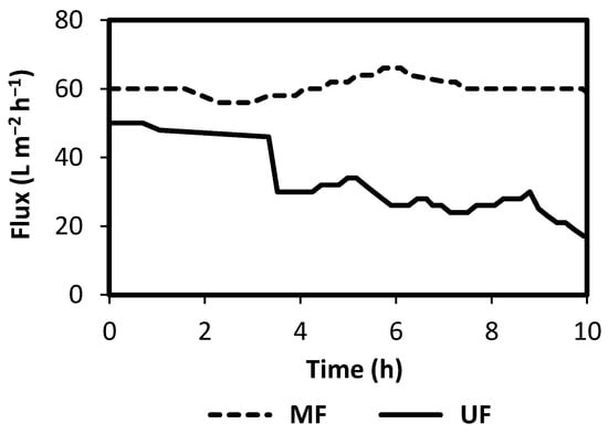 Permeate flux during sewage concentration by MF and UF.