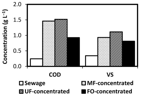 Figure 4 presents COD and VS concentrations of sewage and the concentrates produced by tested membrane processes. Sewage presents low levels of COD, which is the result of the fact that samples were taken after primary settling. The COD content of the concentrated sewage coming from MF and UF presented similar values: 1.46 and 1.52 gCOD L−1, respectively. The COD concentration in the case of the FO process was lower (0.9 gCOD L−1) as a result of a lower volume reduction. Permeate COD concentrations were 0.044 and 0.049 gCOD L−1 for MF and UF, respectively. COD concentration in the permeate of FO was in the range of the detection limit of the tested method, most likely because the high rejection of FO membranes can provide for dissolved organic carbon [37,38]. Performance of MF and UF membranes in terms of COD rejection were similar, despite the differences in pore size. Most likely, this is the result of the effect that fouling can have on the rejection of porous membranes since fouling layers can act as a secondary active membrane [39].