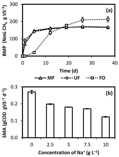 Methane production during BMP assays using concentrates from MF, UF and FO are presented in Figure 5a. BMP was very similar for MF and UF, probably as a result of a similar rejection, as already commented. BMP values were lower than the ones reported by Gong et al. [14] and Hafuka et al. [40], who applied DMF using UF and MF membranes, respectively. This could be partially the result of differences in sewage properties. Interestingly, the BMP was higher for FO concentrate; however, the methane production rate was notoriously slower. Such observations are confirmed by the kinetic parameters calculated using the modified Gompertz model, presented in Table 3. Pm for FO was 30% higher than those for MF and UF, which were almost coincident. On the other hand, Rm for FO was only 11% of that evaluated for MF. Even though concentrates produced by MF and UF presented different values for Rm, BMP kinetics were enough in both cases to provide maximum production in about 10–15 days. It is possible that the COD degradation that occurred during the FO concentration process may have affected the nature of a part of the sewage COD, affecting observed Pm calculated for FO. However, a comparison of observed BMP values may also suggest that solids retained by FO and MF/UF were, at least partially, of a different nature, as a result of the FO rejection of solutes that MF and UF were not able to contain. On the other hand, the lower methane production rate observed for FO (represented by a lower Rm) is most likely the result of the presence of Na+ or other ions, as a result of the high rejection of FO membrane and the reverse salt flux. Figure 5b presents the effect of Na+ concentration on the SMA of the anaerobic sludge used for BMP determination. A concentration of 2.5 gNa+ L−1 already produces a decrease in SMP of about 20% during acetate conversion. Sodium concentration during BMP tests for FO concentrate was close to 2 g L−1, so this factor may have played a role in the methane kinetics observed. This result agrees with the report from Gao et al. [41], who also identified the potential inhibitory effect of NaCl during the anaerobic digestion of FO-concentrated sewage.