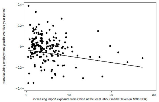 Over the past few decades, the growth in Chinese exports has dramatically changed world trade patterns. As shown in previous literature, the large inflow of Chinese products has had a substantial negative effect on the labor markets in some high-income countries [15]. Furthermore, research has shown that the labor market effect of trade shocks from low-income countries on high-income countries also depends on the institutional setup of the labor market [20,26]. The institutional setup and features of the Swedish labor market differ from those of many other European countries and the United States. Thus, it is important to understand the Swedish labor market’s reaction to increasing import competition from low-income countries such as China. In this study, we apply the methodologies of Autor et al. [15], which rely on the construction of a regional labor market index subject to trade shocks to investigate whether the effect of international manufacturing imports from China on the Swedish labor market (i.e., manufacturing, and non-manufacturing employment growth and wage earnings distribution) is statistically significant.