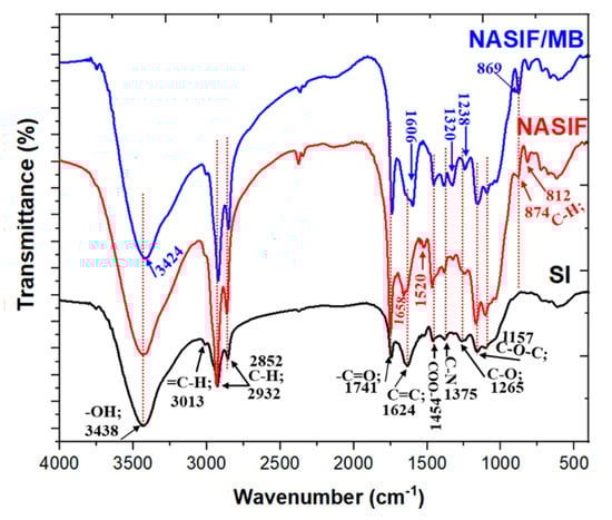 The FTIR technique is an effective technique to identify functional groups of adsorbents. The FTIR spectra of UTSIF, NASIF, and MB-saturated NASIF are presented in Figure 1. The FTIR spectra of UTSIF powder show distinct peaks at 3438, 3013, 2931, 2852, 1741, 1624, 1459, 1375, 1265, 1157, and 1105 cm−1. In detail, the broad peak at 3438 cm−1 is due to –OH stretching vibration of carboxylic acids and phenols in lignin, cellulose, and hemicellulose, suggesting the existence of hydroxyl and carboxylic acid on the surface of UTSIF and NASIF. This band increased in intensity with a small shift to 3443 cm−1 after chemical activation [23,26,31]. The peaks at 3013, 2931, and 2852 cm−1 were attributed to the stretching vibration of =C-H aromatic, asymmetric, and symmetric –C-H in methylene groups, respectively [32]. The strong peaks at 1741 and 1624 cm−1 were due to the C=O (carbonyl, carboxyl) extending vibrations of keto-carbonyl gatherings and C=C bond [2,33,34]. After chemical modification (NASIF) the intensity of this peak increased. The peaks at 1454 cm−1 were due to bending vibrations of the aliphatic C–H bonds or carboxylate asymmetric. This peak sharply increased in intensity and shifted to 1462 cm−1. In addition, a new peak appeared at 1520 cm−1 due to an increase in the oxygen-containing functionalities on the surface of NASIF. The peaks at 1375 cm−1, 1265 cm−1, and (1157–1105 cm−1) were assigned to C-N, C-O, C-O-C bonds [33,35]. A new peak that was observed at 874 cm−1 and 812 cm−1 (after chemical activation) was due to the out-of-plane bending of aromatic C–H [36,37]. Characteristic changes observed in the FTIR spectrum of NASIF after MB adsorption indicated that some peaks increased/decreased in intensity and shifted or disappeared. In detail, the intensity of the –OH and C=O groups shifted to 3424 cm−1 and 1735 cm−1 due to bending of –OH and C=O groups on the surface of NASIF with R(CH3)2N+ sites of MB by electrostatic interactions and H-bonding [35]. In addition, the intensity at 1658 cm−1 increased and shifted to 1606 cm−1, which indicates π-π interactions between the aromatic ring molecule in the NASIF adsorbent and the benzene ring in the MB molecule. Also, a peak of 1520 cm−1 disappeared after MB adsorption onto NASIF surface adsorbent. Furthermore, the peak at 874 cm−1 was increased in intensity and shifted to 869 cm−1 due to H-bond formation between the N atoms of MB and H atoms of NASIF [38]. The observation supports interaction of MB with functional groups of NASIF via electrostatic, H-bonding, n-π interactions, and π-π interactions.