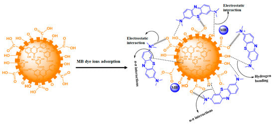 The mechanism of MB dye adsorption onto NASIF was shown in Figure 1. To support the hypothesis given in Figure 1, FTIR analysis of the NASIF-loaded MB was conducted which suggest that the adsorption mechanism of MB on NASIF adsorbent mainly includes electrostatic attraction, n-π interaction, π-π interaction, and hydrogen bonding. There were distinctive changes observed in the FTIR spectrum of NASIF after MB adsorption indicated that some peaks increased/decreased in intensity and shifted or disappeared. In detail, the intensity of the –OH and C=O groups shifted from (3438 to 3424 cm−1) and from (1741 to 1735 cm−1), respectively. This shifting is due to the interactions of –OH and C=O groups on the surface of NASIF with R(CH3)2N+ sites of MB by electrostatic interactions and H-bonding [35]. In addition, the intensity at 1658 cm−1 increased and shifted to 1606 cm−1, which indicates π-π interactions between the aromatic ring molecule in the NASIF adsorbent and the benzene ring in the MB molecule. Further, the peak at 874 cm−1 increased in intensity and shifted to 869 cm−1 due to H-bond formation between the N atoms of MB and H atoms of NASIF [38]. Also, a peak at 1520 cm−1 disappeared after MB adsorption onto NASIF surface adsorbent, which suggests the formation of a n-π type interaction through donation of electron(s) from the oxygen in the carbonyl group present in the NASIF surface to the electron acceptors’ aromatic rings in the MB dye [58,59]. These changes observed in the spectrum suggest interactions of MB dye with the functional groups of the NASIF in the adsorption process [21].