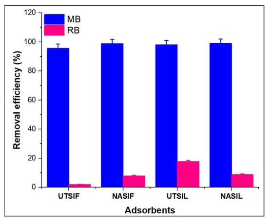 Four adsorbents—UTSIF, UTSIL, NASIF, and NASIL—for the adsorption of cationic dyes (MB and RB dyes) from aqueous solutions were tested under specific condition parameters (dose: Co: 50 mg L−1; m: 40 mg; T: 25 °C; t: 24 h; pH: 6.5), as shown in Figure 5. The outcomes revealed that the four adsorbents show greater adsorption ability toward MB dye (95.6–99.0%) compared to RB dye (1.99–17.78%). In addition, the performance of NASIF and NASIL adsorbent was better than untreated UTSIF and UTSIL adsorbents toward the adsorption of MB dye. The high removal efficiencies of MB dye onto NASIF and NASIL adsorbents owes to the use of H2O2 and NaOH as activation agents [39,40].
