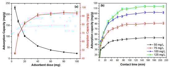 The influence of adsorbent amount in the range from 0.05 mg to 0.1 mg on the adsorption process of MB using NASIF adsorbent has been examined as presented in Figure 6a. The result exhibited that the removal efficiency of MB dye increases significantly from 46.04% to 93.62% when the NASIF adsorbent mass rises from 0.01 g to 0.04 g. By improving the adsorbent amount, more adsorption active sites are available on the NASIF surface for interaction with MB molecules [9]. After this dose, no significant improvement in removal efficiency was observed. Oppositely, the adsorption capacity of NASIF adsorbent reduced significantly to 57.07 mg/g with the amount of NASIF adsorbent increasing to 0.04 g, due to the adsorption capacity being inversely proportional to the mass as per Equation (2) [41]. In addition, the rise in the amount of NASIF adsorbent may result in the aggregation of adsorbent and lead to some of the adsorption active sites overlapping, decreasing the adsorption capacity. These findings were similar to previous studies [2,42]. Thus, 40 mg of NASIF adsorbent was the optimum adsorbent dose in the subsequent studies.