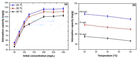 The influence of various concentrations of MB dye (50 to 300 mg/L) on the adsorption process at various temperatures (25 to 45 °C) were investigated (pH: 6.5; m: 0.04 g; t: 120 min), as indicated in Figure 7a. According to Figure 6a, with the initial MB concentration increasing from 50 to 300 mg/L, adsorption capacities of NASIF adsorbent improved from 55.38 mg/g to 127.46 mg/g at 25 °C, 51.76 mg/g to 121.30 mg/g at 35 °C, and 46.54 mg/g to 112.90 mg/g at 45 °C. The increase in adsorption capacity with increasing initial MB concentrations was attributed to the driving force increases [45].