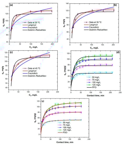 Nonlinear isotherm models at (a) 25 °C, (b) 35 °C, (c) 45 °C, and (d) Nonlinear kinetic models: pseudo-first-order and (e) pseudo-second-order for MB adsorption on NASIF.