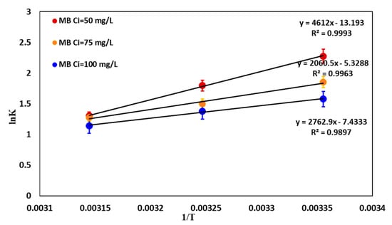 The thermodynamic analysis provides important insights into the adsorption nature and mechanism of adsorption. Therefore, the effect of solution temperature on MB adsorption onto NASIF was achieved through thermodynamic properties, as summarized in Table 4. Thermodynamic parameters including enthalpy change (∆H°, kJ/mol) and entropy change (∆S°, kJ/mol·K) were calculated using van’t Hoff equation Equation (11), while the free energy change (∆G°, kJ/mol), was calculated using Equation (10) as follows: