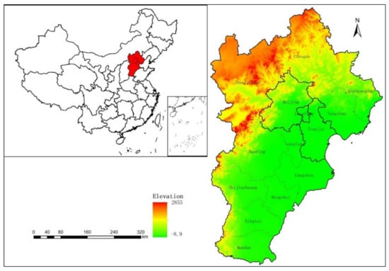 The Beijing-Tianjin-Hebei region is located in the heart of the Bohai Rim (36°01′–42°37′N, 113°04′–119°53′E), including the Beijing and Tianjin municipalities and Hebei Province (Figure 1), with the Yanshan Mountains in the north, North China Plain in the south, Taihang Mountains in the west and Bohai Bay in the east. There are various landforms in the Beijing-Tianjin-Hebei region, with mountains, plateaus, and basins in the west and north, and plains in the east and south. The topography is high in the northwest and low in the southeast, with a total area of 21.66 × 104 km2, accounting for 2.27% of the total national area.
