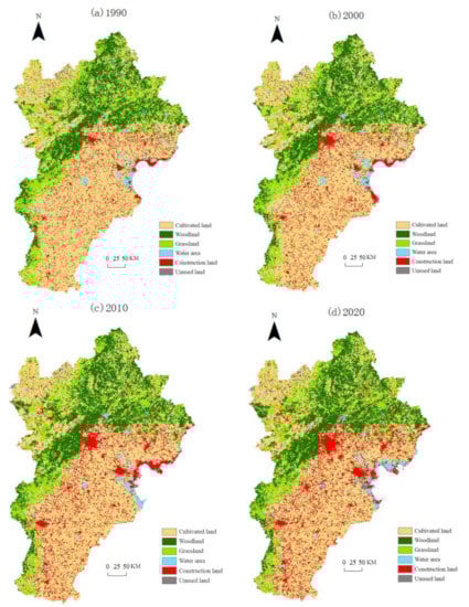 The LULC datasets (1990, 2000, 2010, 2020) were obtained from the Resource and Environment Data Center of the Chinese Academy of Sciences (http://www.Resdc.cn Accessed on 11 December 2021); the dataset was generated by manual visual interpretation using Landsat TM/ETM/OLI remote sensing images of various phases as the primary data source with a spatial resolution of 30 m. The LULC types were classified into six categories: farmland, woodland, grassland, water area, constructed land, and unused land; the overall accuracy of the 2020 LULC map is 86.4%. The DEM data were obtained from NASA (https://search.asf.alaska.edu Accessed on 11 December 2021), the elevation data collected with the ALOS (Advanced Land Observing Satellite, launched in 2006) satellite phased array L-band synthetic aperture radar (PALSAR) with a spatial resolution of 12.5 m. The river, temperature, precipitation, and road data were obtained from the Hebei Ecological Local Database of the Hebei Institute of Geographical Sciences; the river spatial distribution data were extracted based on the China’s 1: 1,000,000 river dataset, the temperature and precipitation data were based on the daily observational data of meteorological stations in the study area, which were generated through sorting, calculations, and spatial interpolation processing. The socioeconomic data (population, gross domestic product (GDP)) were obtained from the Hebei Economic Yearbook. These data were mainly used to research the driving factors of the land use change.