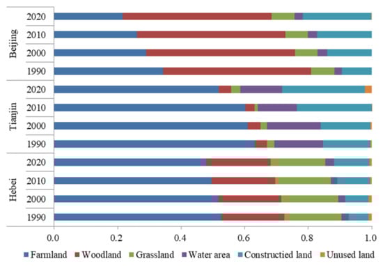As can be seen from Figure 3, in Beijing, the composition of the land use types was as follows: farmland > forest > grassland > constructed land > water bodies > unused land. In Tianjin, the composition was as follows: farmland > constructed land > water bodies > forest > grassland > unused land. In Hebei the composition was as follows: farmland > forest > grassland > constructed land > water bodies > unused land. Overall, during 1990–2020, the proportions of farmland, grassland, and unused land decreased, while water bodies, forest, and constructed land increased. It should be noted that the farmland decreased the most, by about 6%, and the construction land increased by about 6%. The other LUCC type exhibited slightly fluctuating trends. It can be seen that the increase in the construction land in the Beijing-Tianjin-Hebei region was mainly at the expense of the farmland. Table 5 showed the transition of LULC change between 1990–2020; the land use transformation was mainly from farmland to construction land. Woodland was the most stable land type, 94.94% had not changed, while unused land was the most unstable land type, and only 34.98% had not changed.
