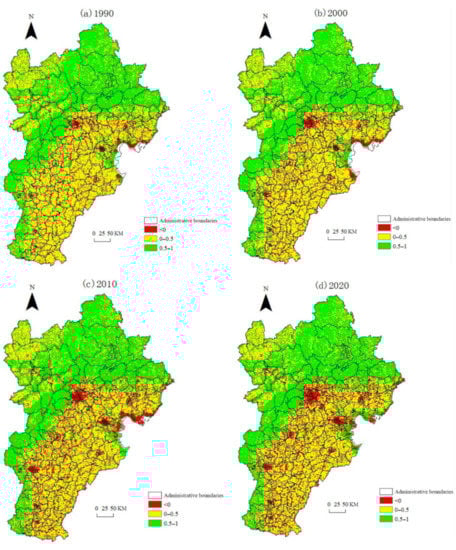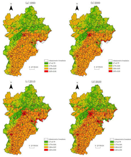 The supply rate of the ES in the Beijing-Tianjin-Hebei region increased from 0.78 to 0.81 from 1990 to 2020. As shown in Figure 4, the supply rate of the ES in the Beijing-Tianjin-Hebei was between 0.7 and 0.9 from 1990 to 2020. The supply rate in the northern and western parts of the Beijing-Tianjin-Hebei was lower than that in the central and eastern parts, especially in the counties of Beijing and Tianjin. From the perspective of the spatial changes, the main areas around the cities changed significantly. Among them, the ecosystem service supply rate in the areas surrounding Beijing, Tianjin, Shijiazhuang, and other cities increased significantly. Compared with 1990, in 2020, the potential of the ESs in the counties with regional supply rates of 0.8–0.85 in the Beijing-Tianjin-Hebei region was further exploited and the restricted supply rates gradually increased to 0.85–0.9. The number of counties with supply rates of 0.8–0.85 decreased from 110 in 1990 to 59 in 2020, while the number of counties with values of 0.85–0.9 increased from 43 to 95. At present, the potential of the ESs is small, and the pressure of the ES supply is enormous.