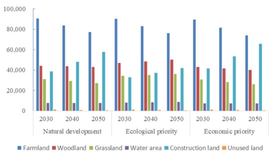 The land use type demand in the different development target scenarios was calculated (Figure 6). From 2030 to 2050, with the three different development goals, the demand for built-up land will increase, and the demand for farmland and unused land will continue to decrease. It should be noted that the demand for construction land varies greatly in the different scenarios. The demand for ecological priority is 32,727–41,920 hm2, and the demand for economic priority is 41,584–65,540 hm2. The difference is large. The demand for construction land increases, and the demand for woodland and grassland continuously increases with the ecological priority targets; while with the natural development and economic priority targets they continuously decrease. In addition, the reduction in demand with the economic priority targets is more pronounced; the demand for water bodies with natural development and ecological priority targets increases; while its decrease with the economic priority target.