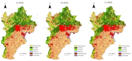 According to Figure 7, the main land use type in the Beijing-Tianjin-Hebei region from 2030 to 2050 will be farmland, which will mainly be distributed in the low plains area in Hebei Province. The forest and grassland will mainly be distributed in the Yan Mountains-Taihang Mountains and the northern part of Hebei Province. The water bodies will mainly be distributed in the eastern coastal area of Hebei Province, and the construction land will mainly be distributed in the Beijing-Tianjin area.