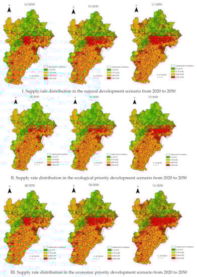 As can be seen from Figure 8, in the natural development scenario, the high value area (0.85–0.90) of the ES supply rate will be distributed in the Beijing-Tianjin area and will form a contiguous shape in the middle of the study area. The median value area (0.75–0.85) will mainly be distributed in the southeastern part of the study area, and the low value area (0.70–0.75) will mainly be distributed in the northern and western mountainous regions, forming a semi-circular shape. The spatial distribution of the ES supply rate in the ecological priority development scenario will be the same as that in the natural development scenario. The differences are mainly reflected in the Zhangjiakou area in the northwestern area and around Beijing. The supply rate values of these two areas in the ecological priority scenario will be relatively small. Compared with the natural development scenario, the high value area of the supply rate in the economic priority development scenario will have a more extensive spatial range, mainly expanding to the eastern region; and the low value areas will become smaller, mainly in the southwest. In the natural development scenario, compared with 2020, the number of counties with values of 0.85–0.9 in 2030, 2040, and 2050 will increase to 110, 118, and 123, respectively. The potential of the ESs will be small, and the pressure of the ES supply will be enormous. In the ecological priority development scenario, the number of counties with ecosystem service supply ratios of 0.7–0.75 will increase to 7, 12, and 12 in 2030, 2040, and 2050, respectively, in the Beijing-Tianjin-Hebei region. Overall, the pressure on the ES supply will be less than in 2020. In the economic priority development scenario, the ES supply rate in the Beijing-Tianjin-Hebei region will increase from 2030 to 2050. Compared with 2020, the number of counties with values of 0.85–0.9 in 2030, 2040, and 2050 will increase to 113, 128, and 134, respectively, and the entire region will be in a high-pressure state.
