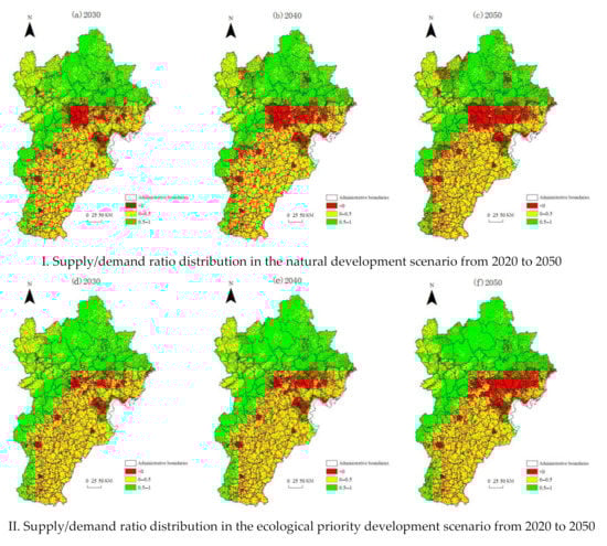 Supply/demand ratio distributions in the Beijing-Tianjin-Hebei region with multiple objectives from 2020 to 2050.
