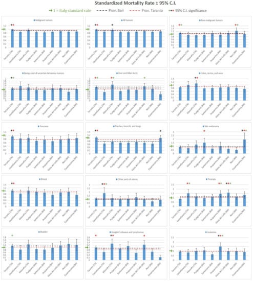 - Martinelli, D.; Mincuzzi, A.; Minerba, S.; Tafuri, S.; Conversano, M.; Caputi, G.; Lopalco, P.L.; Quarto, M.; Germinario, C.A.; Prato, R. Malignant cancer mortality in Province of Taranto (Italy). Geographic analysis in an area of high environmental risk. J. Prev. Med. Hyg. 2009, 50, 181–190. [Google Scholar]