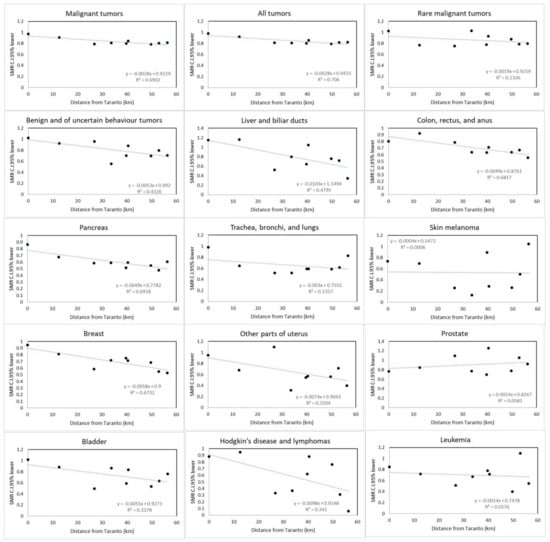4. Correlation between Standardized Mortality Rates and the Distance from the City of Taranto