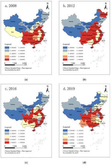 Spatiotemporal evolution of China’s provincial agricultural water use efficiency (AWUE). The data in Figure 1 were calculated according to a slack-based data envelopment analysis (DEA) method, and data can be obtained from the corresponding author upon request (e-mail: gongguofang@2020.cqut.edu.cn). (a) China’s provincial AWUE in 2008; (b) China’s provincial AWUE in 2012; (c) China’s provincial AWUE in 2016; (d) China’s provincial AWUE in 2019.